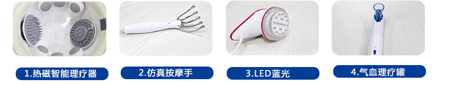 STEP1. 用气血理疗罐疏通七条经络:督脉、膀胱经、大肠、 小肠、三焦经、胆经、胃经。 STEP2.把热磁智能理疗仪戴在头上,加速血液和淋巴循环、改 善细胞缺血缺氧状态,起到活血化瘀、消炎镇痛等作用。 STEP3.手握仿真按摩手疏通颈、头部经络,头部淋巴管和淋巴 结,及穴位(见右图)。 STEP4.LED蓝光照射皮肤,杀菌消炎,润养头皮。 |