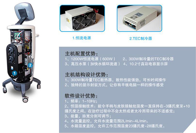A、西安炬光微通道600W激光器; B、1.2cm*1cm匀化光斑(600W),输出脉宽2ms-300ms;能量计算公式 : E=P*T(P激光器出光为功率,T为激光工作脉宽) C、TEC半导体制冷50W; D、石英匀化光锥; E、蓝宝石窗口镜片。 2)手具结构设计优势: A、结构轻巧,美观,手持感舒适,外观 专利。 B、内部结构设计合理,散热性能强劲,冰点制冷速度快。