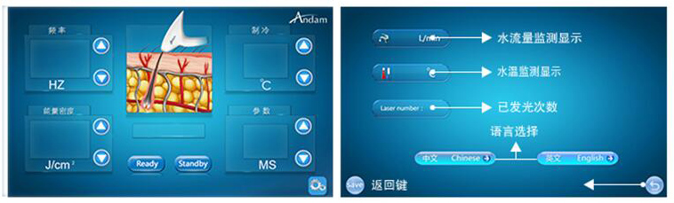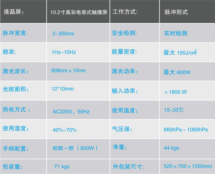 说明:此款808脱毛治疗仪器采用智能操作模式设计:脉宽、频率、能量为系统自动设置,同时支持参数在治疗安全值的范围内进行调节。